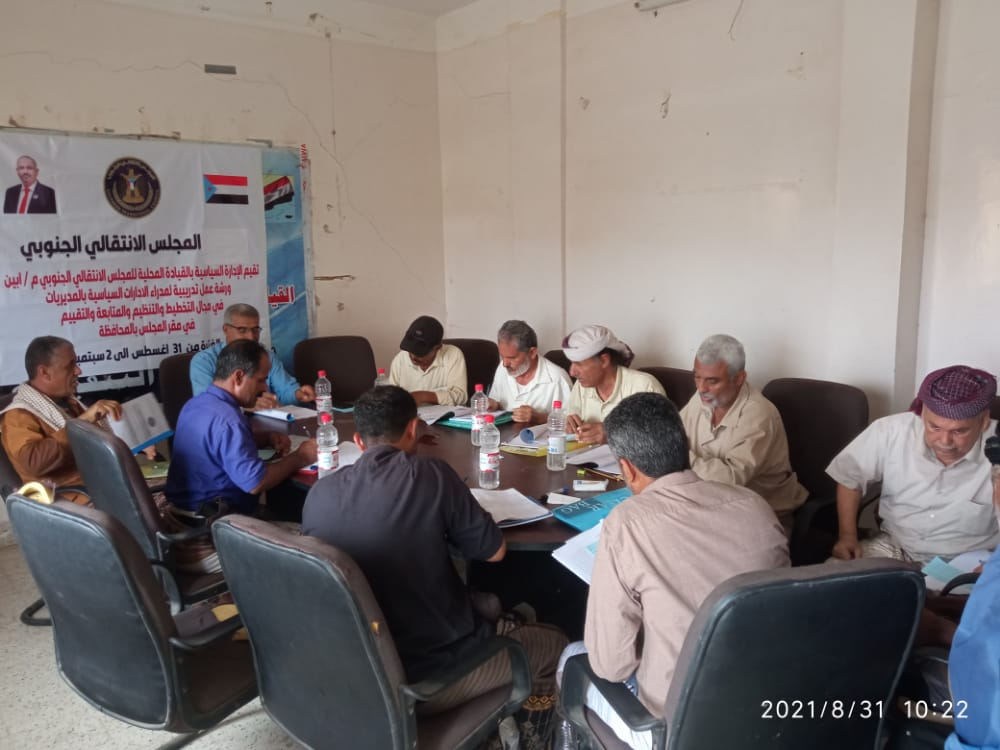 دشنت الإدارة السياسية بالهيئة التنفيذية للقيادة المحلية للمجلس الانتقالي الجنوبي بمحافظة أبين، اليوم الأربعاء، ورشة تدريبية في مجال التخطيط والتنظيم والمتابعة والتقييم برعاية الأمانة العامة لهيئة رئاسة المجلس الانتقالي الجنوبي.