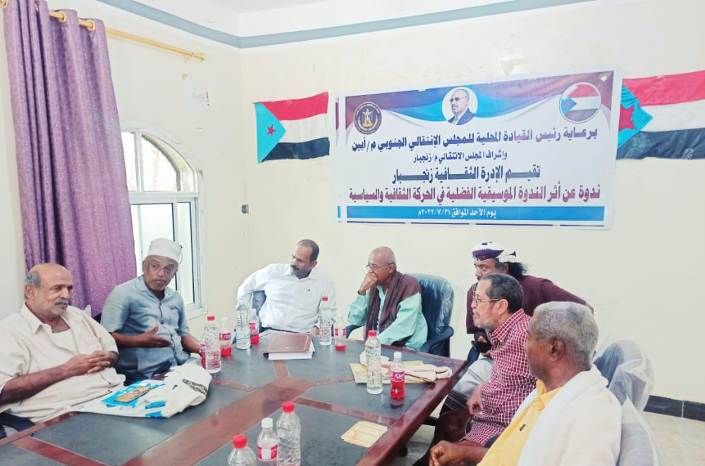 نظمت الإدارة الثقافية لانتقالي زنجبار، اليوم الأحد, بقاعة منسقية المجلس الانتقالي الجنوبي, بجامعة ابين، ندوة ثقافية، حول أثر الندوة الموسيقية الفضلية في الحركة الثقافية والسياسية، بحضور رئيس الهيئة التنفيذية لانتقالي بالمديرية، معمر شيخ .