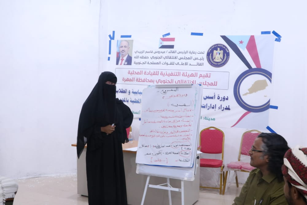 نفذت إدارة الشباب والطلاب في الهيئة التنفيذية للمجلس الانتقالي الجنوبي بمحافظة المهرة، اليوم السبت، دورة تدريبية حول "أسس تخطيط وتقييم الأنشطة الشبابية والطلابية"، برعاية كريمة من الرئيس عيدروس قاسم الزُبيدي رئيس المجلس الانتقالي الجنوبي.