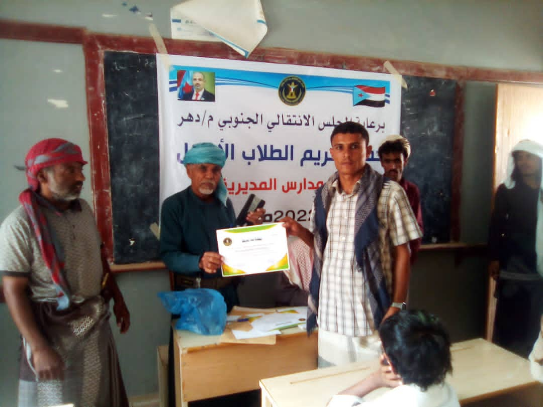 وفي ختام الحفل قامت قيادة انتقالي دهر بتكريم المعلمين والمعلمات بشهادات تقديرية، وكذا تم تكريم اوائل الطلاب بشهادات تقديرية وأدوات مدرسية.