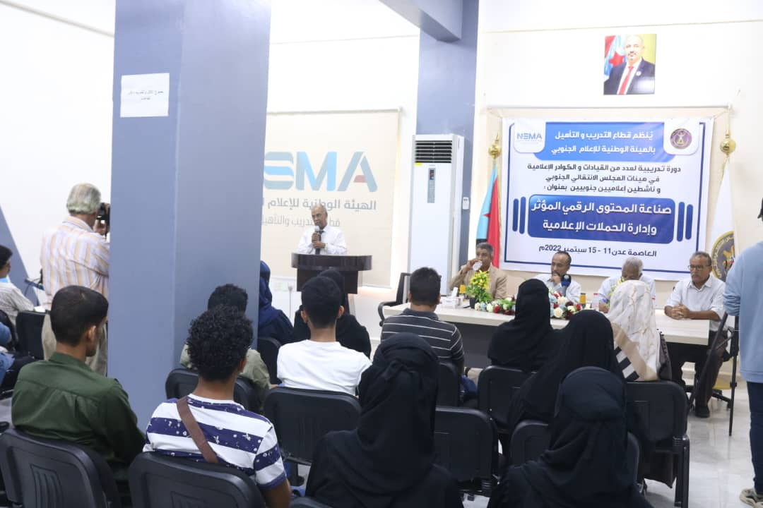 دشَّنَ قطاع التدريب والتأهيل بالهيئة الوطنية للإعلام الجنوبي بالعاصمة عدن، اليوم الأحد، بمركز التدريب الإعلامي دورة تدريبية في صناعة المحتوى الرقمي وإدارة الحملات الإعلامية، لإعلاميي هيئات المجلس الانتقالي الجنوبي، برعاية كريمة من الرئيس القائد عيدروس قاسم الزُبيدي رئيس المجلس الانتقالي الجنوبي.