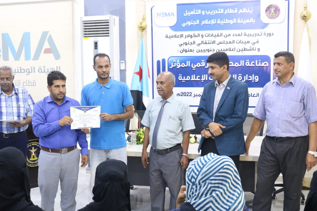 اختتم قطاع التدريب والتأهيل بالهيئة الوطنية للإعلام الجنوبي، اليوم الأربعاء، في مركز التدريب الإعلامي بالعاصمة عدن، الدورة التدريبية في "صناعة المحتوى الرقمي وإدارة الحملات الإعلامية" لقيادات وإعلاميي هيئات المجلس الانتقالي الجنوبي والنشطاء الإعلاميين الجنوبيين، برعاية كريمة من الرئيس القائد عيدروس قاسم الزُبيدي رئيس المجلس الانتقالي الجنوبي.