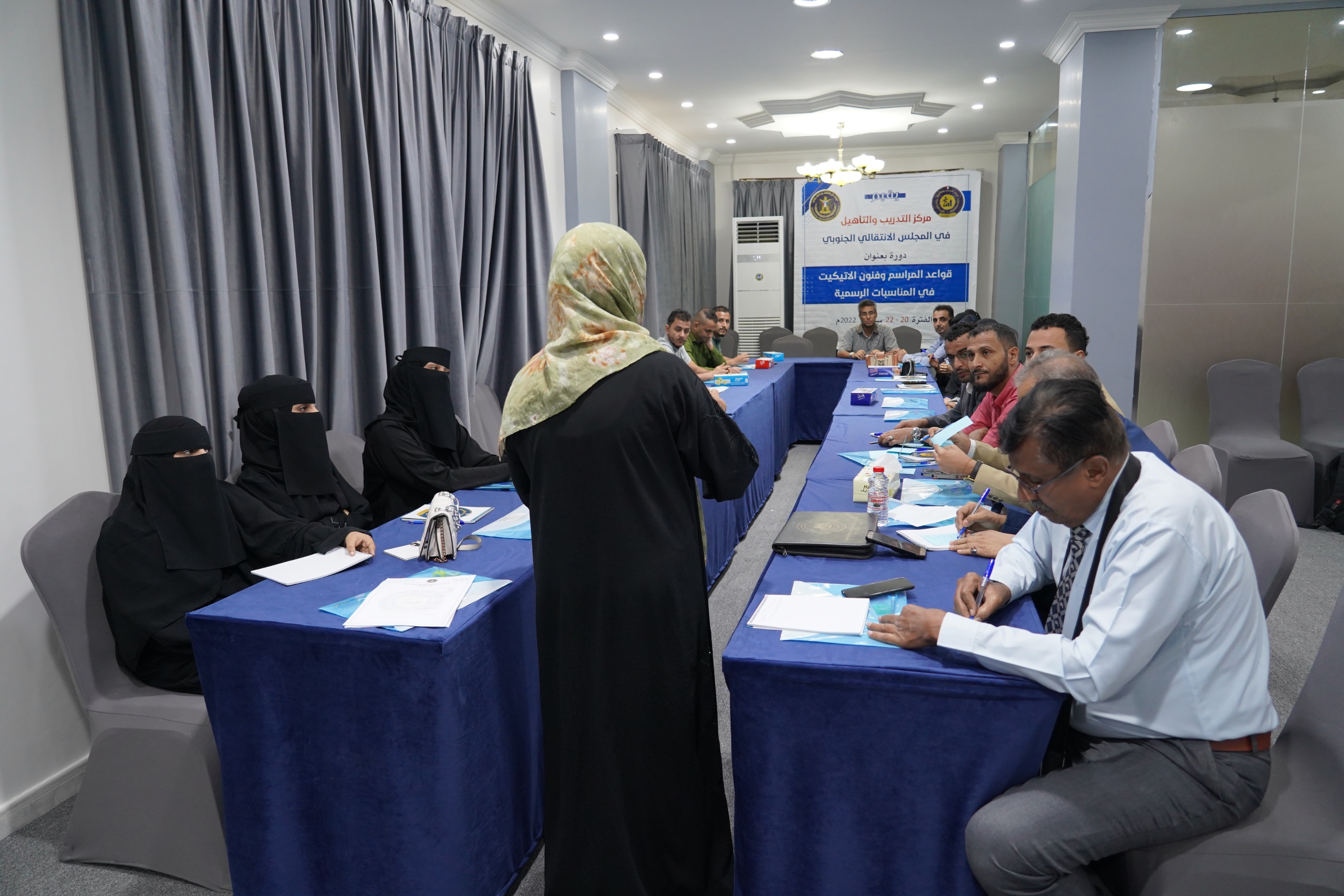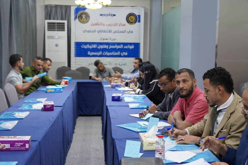 وتلقى 20 مشاركاً من مختلف هيئات المجلس الانتقالي الجنوبي دورة تدريبية خاصة بالبروتوكول وقواعد المراسم وفنيات العمل في هذا المجال، حرصاً على الوصول بالعمل المؤسسي المنظم إلى أعلى مراحل التقنين والانضباط لما له من أثر واضح على العلاقات المحلية والدولية.