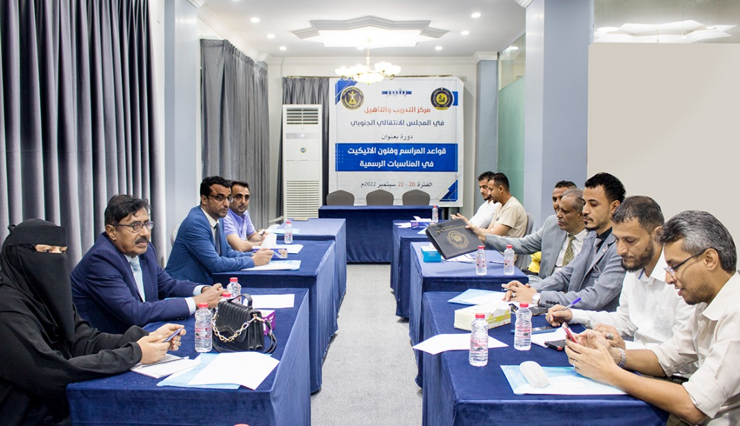 وتلقى المشاركون في اليوم الختامي للدورة التي استمرت لمدة ثلاثة أيام على التوالي بمشاركة عشرون موظفا من مختلف الهيئات للمجلس الانتقالي، شرحاً واسعا حول اتكيت الطعام والجلوس على المائدة، بالإضافة إلى اتكيت الملابس والدعوات ومغادرة الحفلات والزيارات والمكالمات الهاتفية، جرى عقبها توزيع الشهادات على المشاركين.