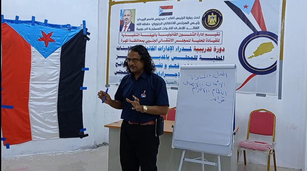 نظمت إدارة الشؤون القانونية في الهيئة التنفيذية للمجلس الانتقالي الجنوبي بمحافظة المهرة، اليوم السبت، دورة تدريبية لمديري الإدارات، حول "مهارات فهم وتفسير وتطبيق اللوائح والإجراءات الداخلية للمجلس".