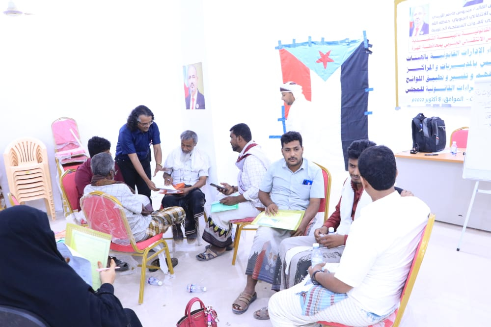 واستعرض المدرب خليل عبودان في جلسات التدريب الأولى والثانية، المفاهيم القانونية وعلاقتها بالإدارة والتنظيم القانوني المؤسسي للمجلس الانتقالي الجنوبي، موضحًا المهام المناطة بمديري الإدارات القانونية بالهيئات المحلية واللوائح والإجراءات الداخلية للمجلس.