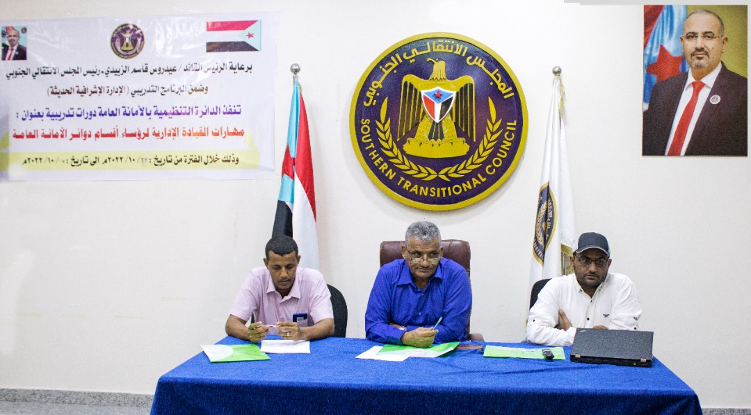 وأشار نائب رئيس الدائرة التنظيمية، إلى أن خطة تنظيم دورات القيادة الإدارية والتي ستشمل تدريب كافة رؤساء أقسام دوائر الأمانة العامة على ثلاث مجموعات لمدة ثلاثة أسابيع تأتي ضمن اهتمام ومتابعة الأستاذ فضل محمد الجعدي عضو هيئة رئاسة المجلس الانتقالي، نائب الأمين العام.