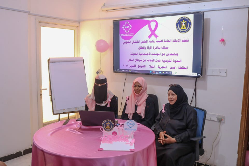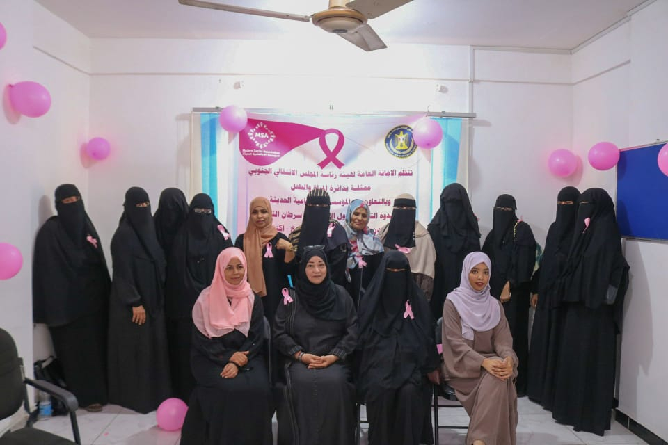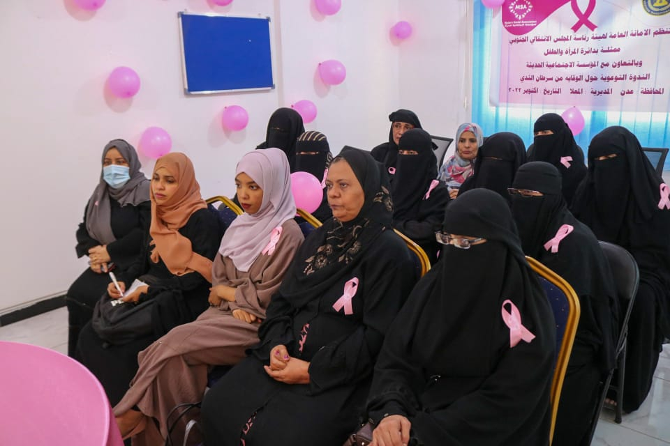 نظمت دائرة المرأة والطفل في الأمانة العامة لهيئة رئاسة المجلس الانتقالي الجنوبي، اليوم الأربعاء، ندوة توعوية حول الوقاية من سرطان الثدي، بالشراكة مع المؤسسة الاجتماعية الحديثة في العاصمة عدن.
