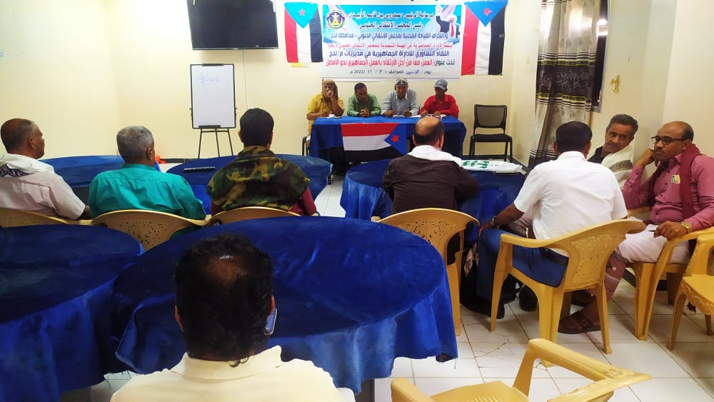 عقدت الإدارة الجماهيرية بالهيئة التنفيذية للقيادة المحلية بالمجلس الانتقالي الجنوبي في محافظة لحج، اليوم الاثنين، لقاءً تشاوريًا لمديري إداراتها بالمديريات، تحت شعار "العمل معًا من أجل الارتقاء بالعمل الجماهيري نحو الأفضل".