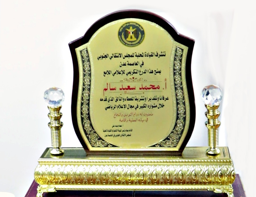 وخلال الاحتفالية، التي اقيمت بمقر القيادة المحلية للمجلس بالتواهي، قدم القائم بمهام رئيس تنفيذية انتقالي العاصمة عدن، الأستاذ عصام عبده علي، درعا تكريميا مميزا للأستاذ محمد، تقديرا وعرفانا وتشريفا لكل ماقدمه من تألق وابداع خلال مشواره الكبير والطويل في مجال الصحافة والإعلام الرياضي الجنوبي والعربي.