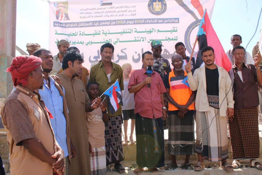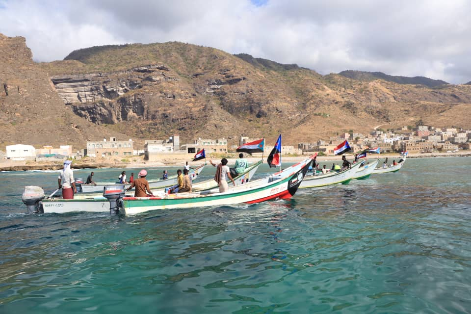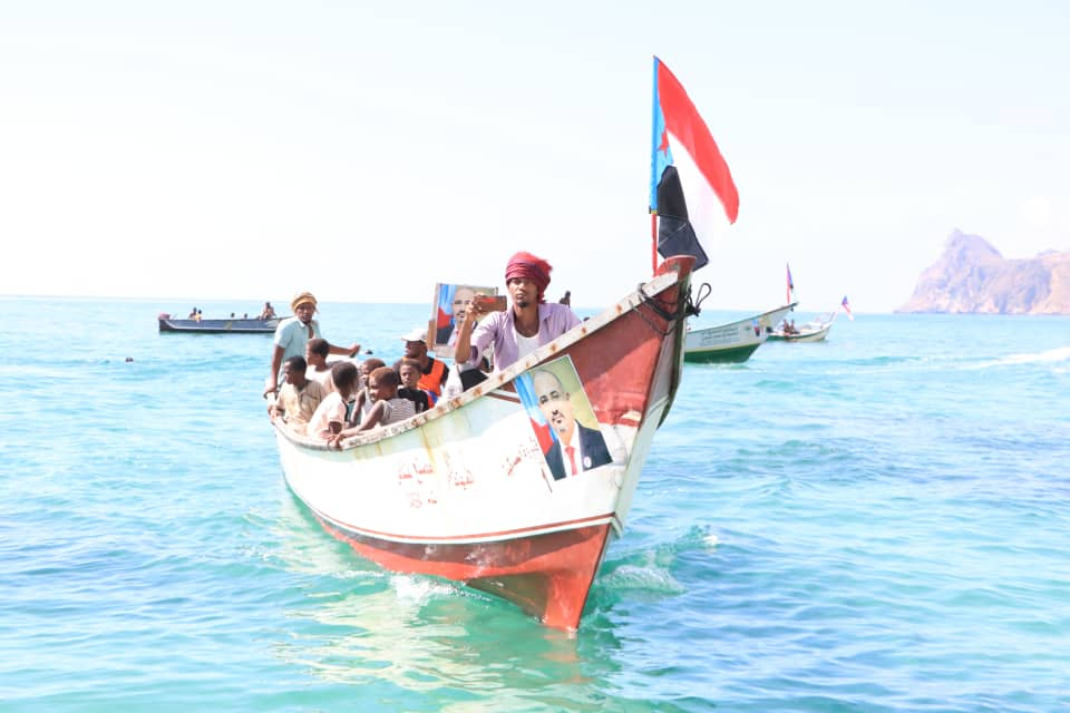 وقدم مجموعة كبيرة من الصيادين من مختلف مناطق مديرية حوف، عرض بحري بواسطة 50 قارب تزينت بأعلام دولة الجنوب، وصور الرئيس القائد الزُبيدي، منطلقة من منطقة رهن إلى منطقة حوف.