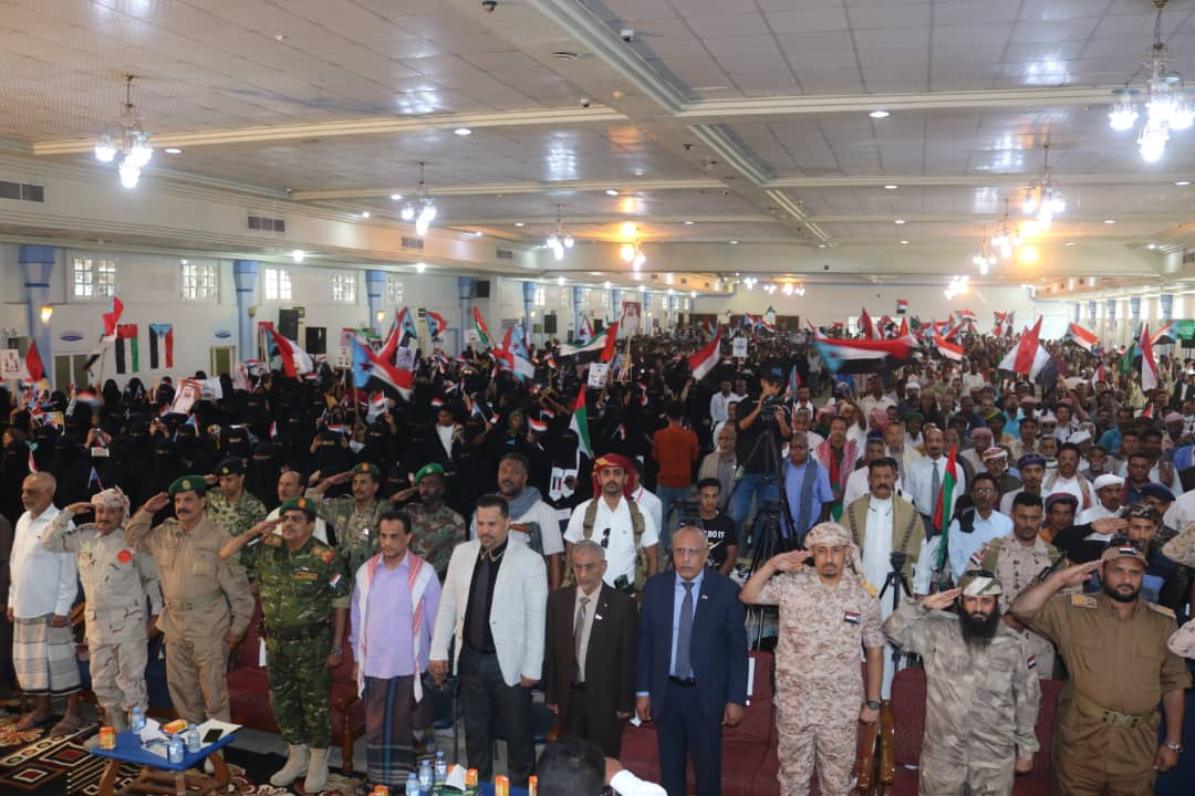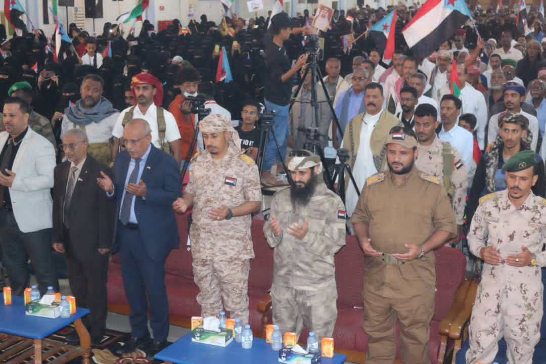 واستهل الحفل الجماهيري، الذي حضره عضوا هيئة رئاسة المجلس الانتقالي الجنوبي، الشيخ أحمد محمد بامعلم والأستاذ علي عبدالله الكثيري، المتحدث الرسمي باسم المجلس، والعميد الركن سعيد أحمد المحمدي رئيس الهيئة التنفيذية للقيادة المحلية للمجلس بالمحافظة ، وعدد من القيادات العسكرية والأمنية الجنوبية البارزة، والمسؤولين في السلطة المحلية بالمحافظة، بآي من الذكر الحكيم، ثم النشيد الوطني، والوقوف دقيقة صمت لقراءة الفاتحة على أرواح شهداء الجنوب والأشقاء الإماراتيين.