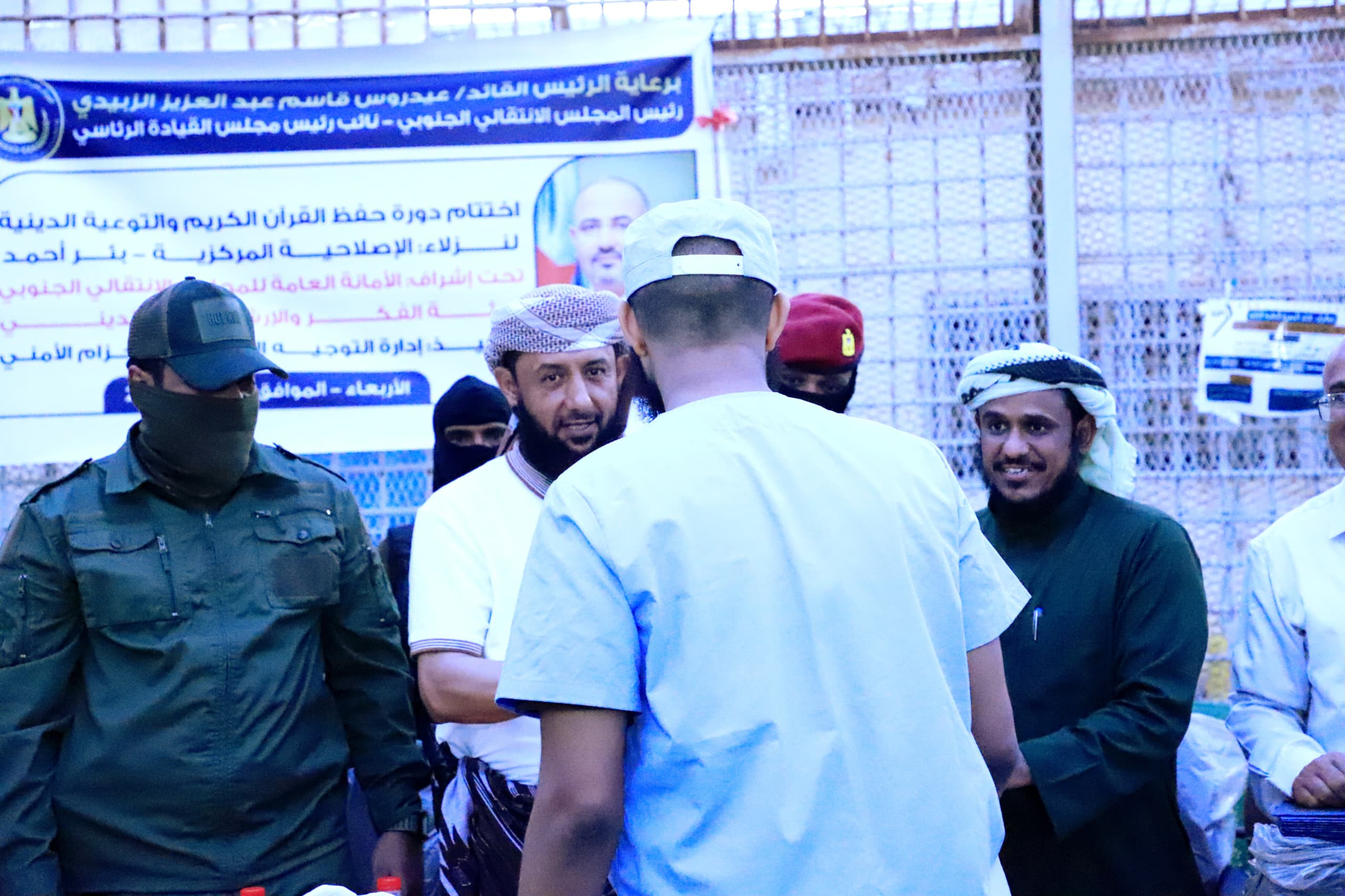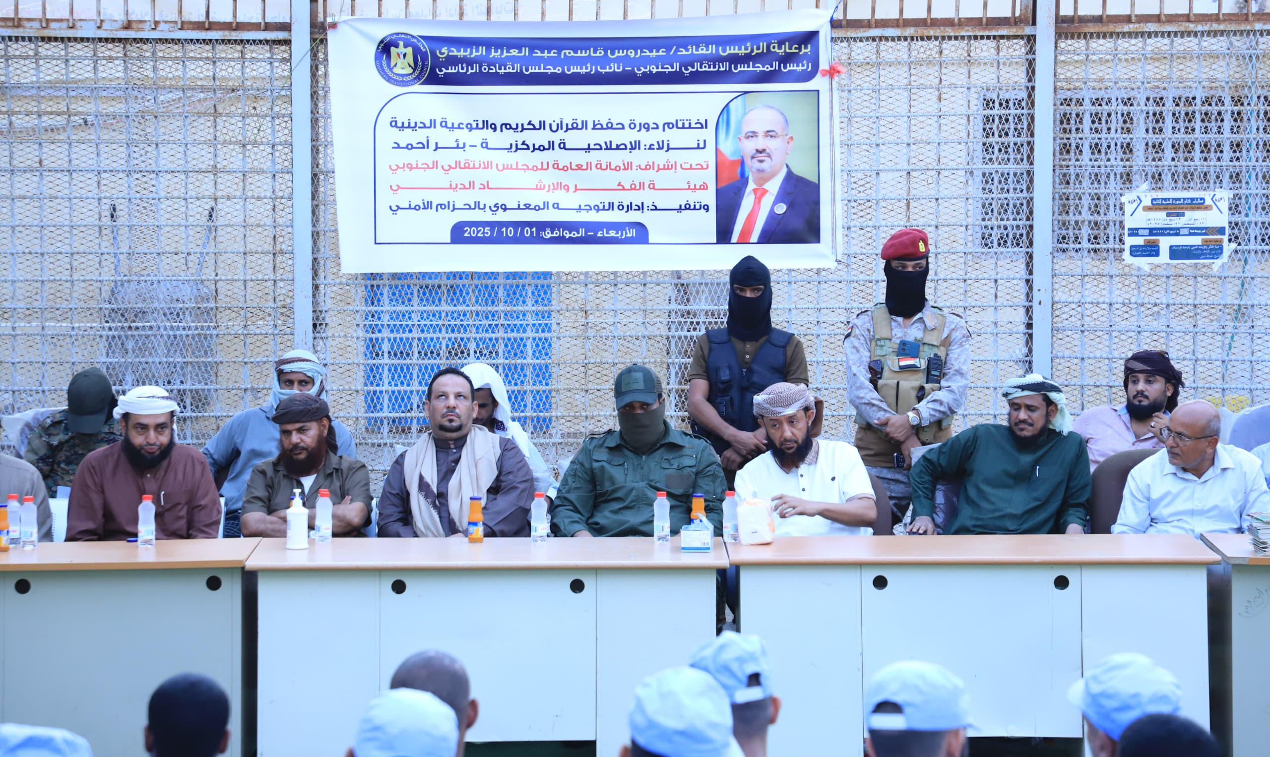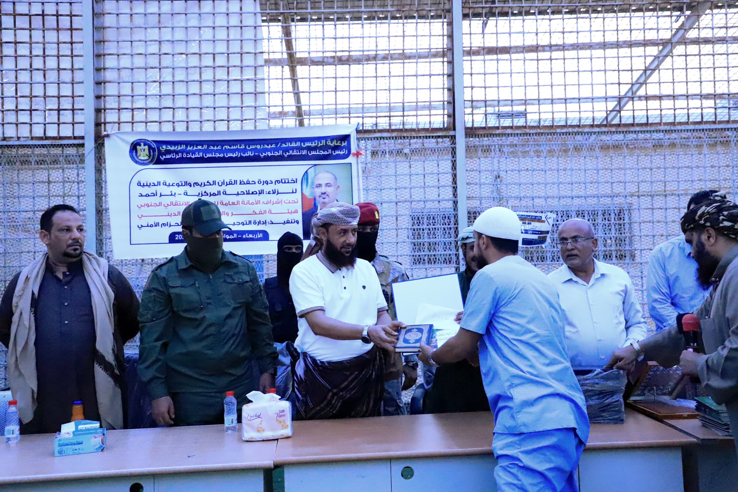 اختتمت اليوم الأربعاء في الإصلاحية المركزية في بئر أحمد بالعاصمة عدن، دورة لحفظ القرآن الكريم والتوعية الدينية الموجهة لنزلاء الإصلاحية، وذلك بإشراف هيئة الفكر والإرشاد الديني في الأمانة العامة لهيئة رئاسة المجلس الانتقالي الجنوبي، وبتنفيذ من إدارة التوجيه المعنوي في قوات الحزام الأمني.