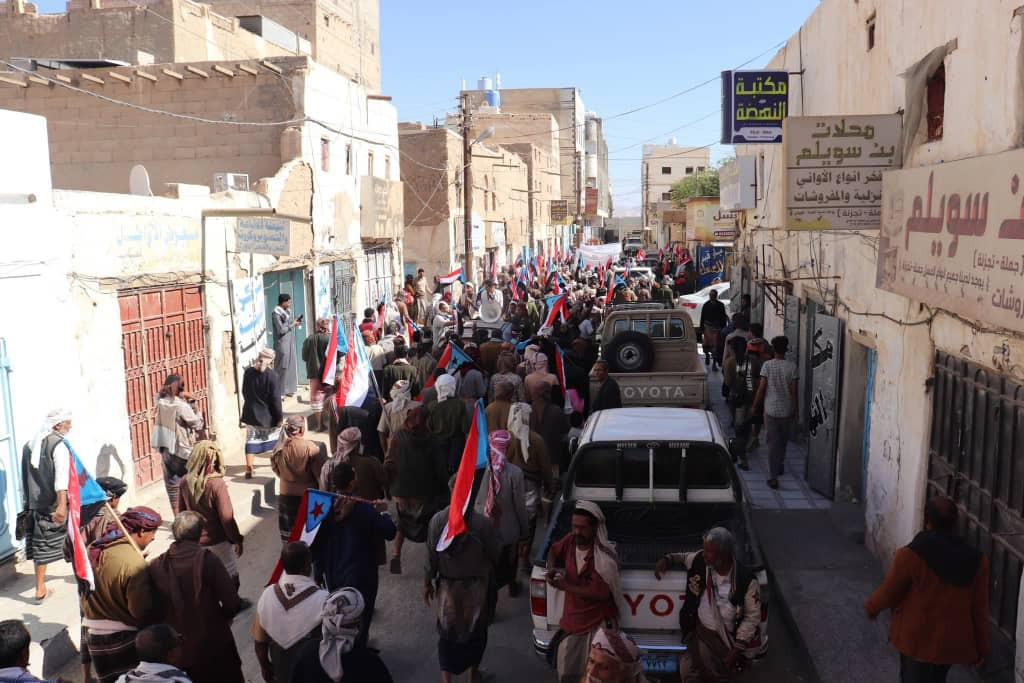 وعبّر المشاركون في المسيرة الجماهيرية عن فرحتهم بالنصر الذي حققته القوات المسلحة الجنوبية في عارين وادي حضرموت، مرددين الهتافات المطالِبة بسرعة الإعلان عن دولة الجنوب العربي.