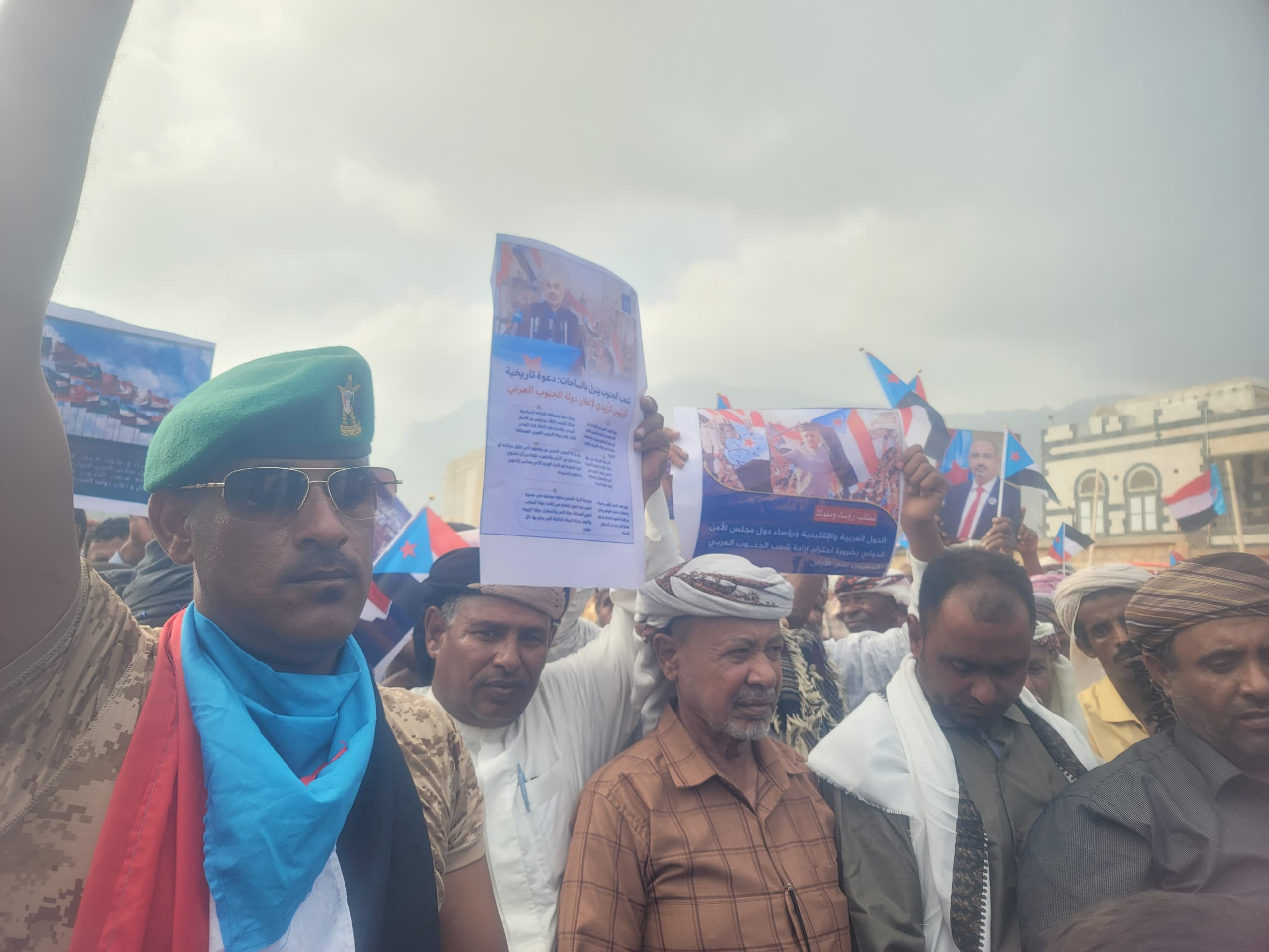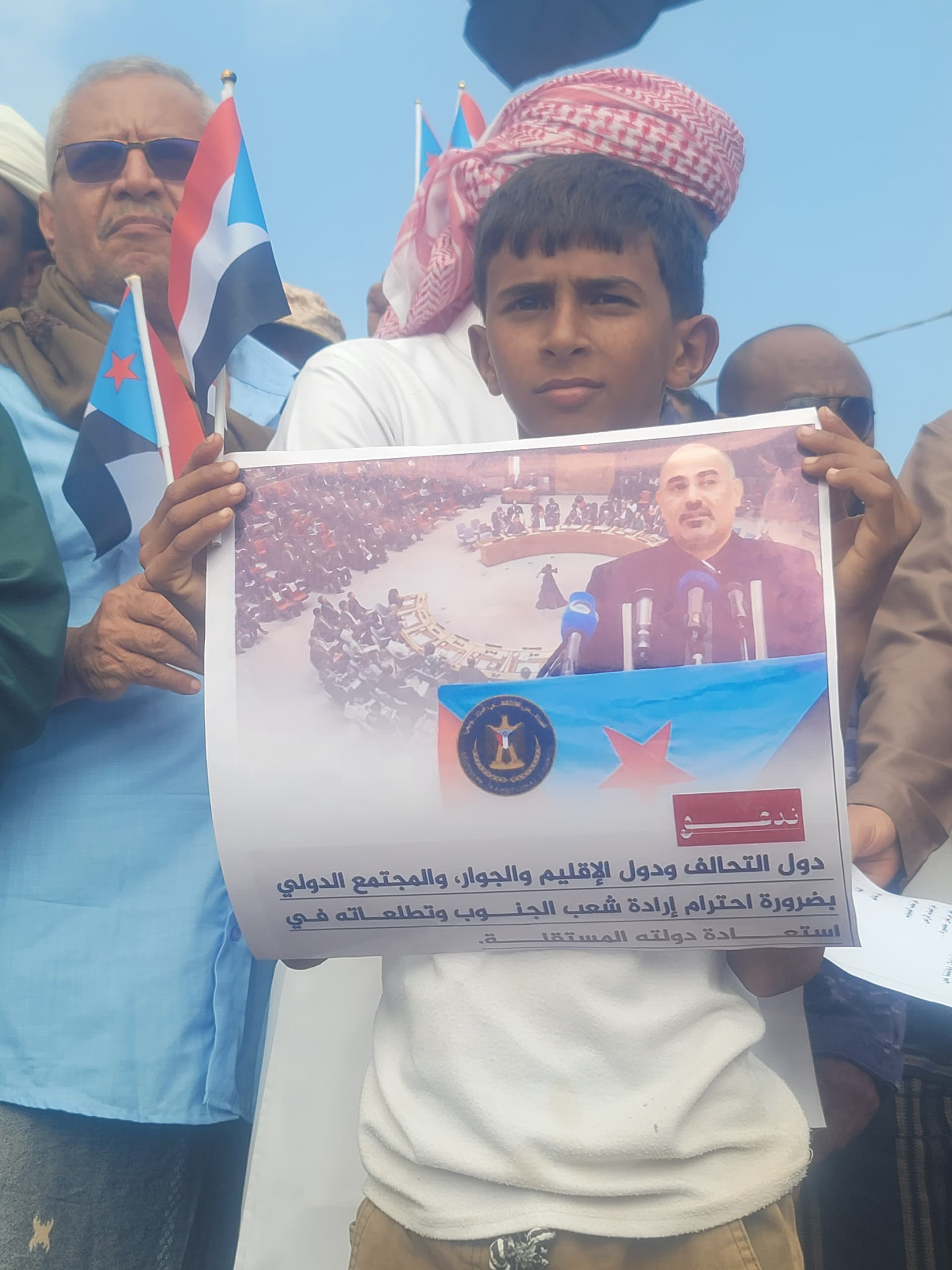 ورفع المشاركون في الاعتصام لافتات تطالب التحالف العربي والمجتمع الدولي والأمم المتحدة باحترام إرادة الشعب الجنوبي، معتبرين أن إعلان دولة الجنوب العربي حق تاريخي وسياسي يعبر عن إرادتهم.